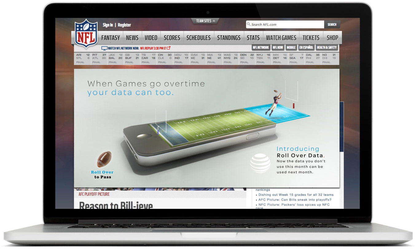 A series of high-impact homepage takeovers launching AT&T’s Rollover Data feature across major media platforms. The work translated a simple product benefit into culturally relevant moments—integrating sports, travel, and entertainment environments to demonstrate flexibility and continuity in real time.